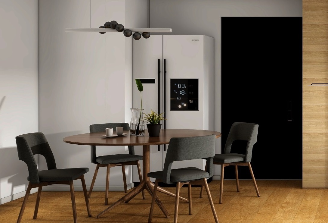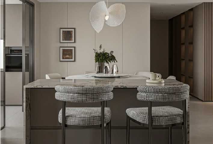 打開傳統廚房設置,加強廚房與餐廳一體化,緊密的將廚房與餐廳一體化,拓寬了空間視野的同時也擴大了實際的空間層次。冰箱位置的放置也加強了業主實際的使用便利性。