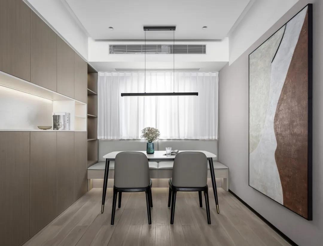 ??餐桌正對(duì)面就是一組白色餐邊柜,柜子中間采用鏤空設(shè)計(jì),墻上還做了一塊隔板,用來(lái)放置小擺,吊柜下方裝了一排射燈,從各個(gè)角度看,都是美麗的;人間煙火氣,最撫慰人心,餐廳煙火氣的聚散,恰是世界上最溫馨的事物,與家人共享美食,即便是粗茶淡飯,也覺(jué)得幸福、美好。