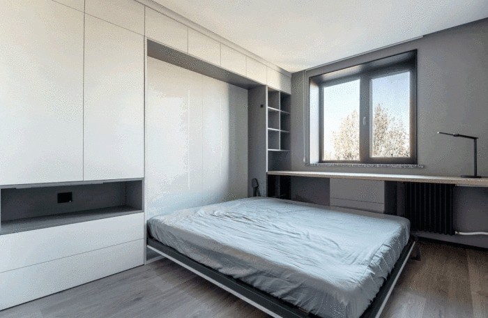 ??書桌可以用來學(xué)習(xí)、化妝,還解決了床頭的置物需求,同時(shí)又隔斷了兩個(gè)不同的生活區(qū),柜門還隱藏了一個(gè)臺(tái)盆柜,完美提高了空間利用率,讓生活更加井井有條。
