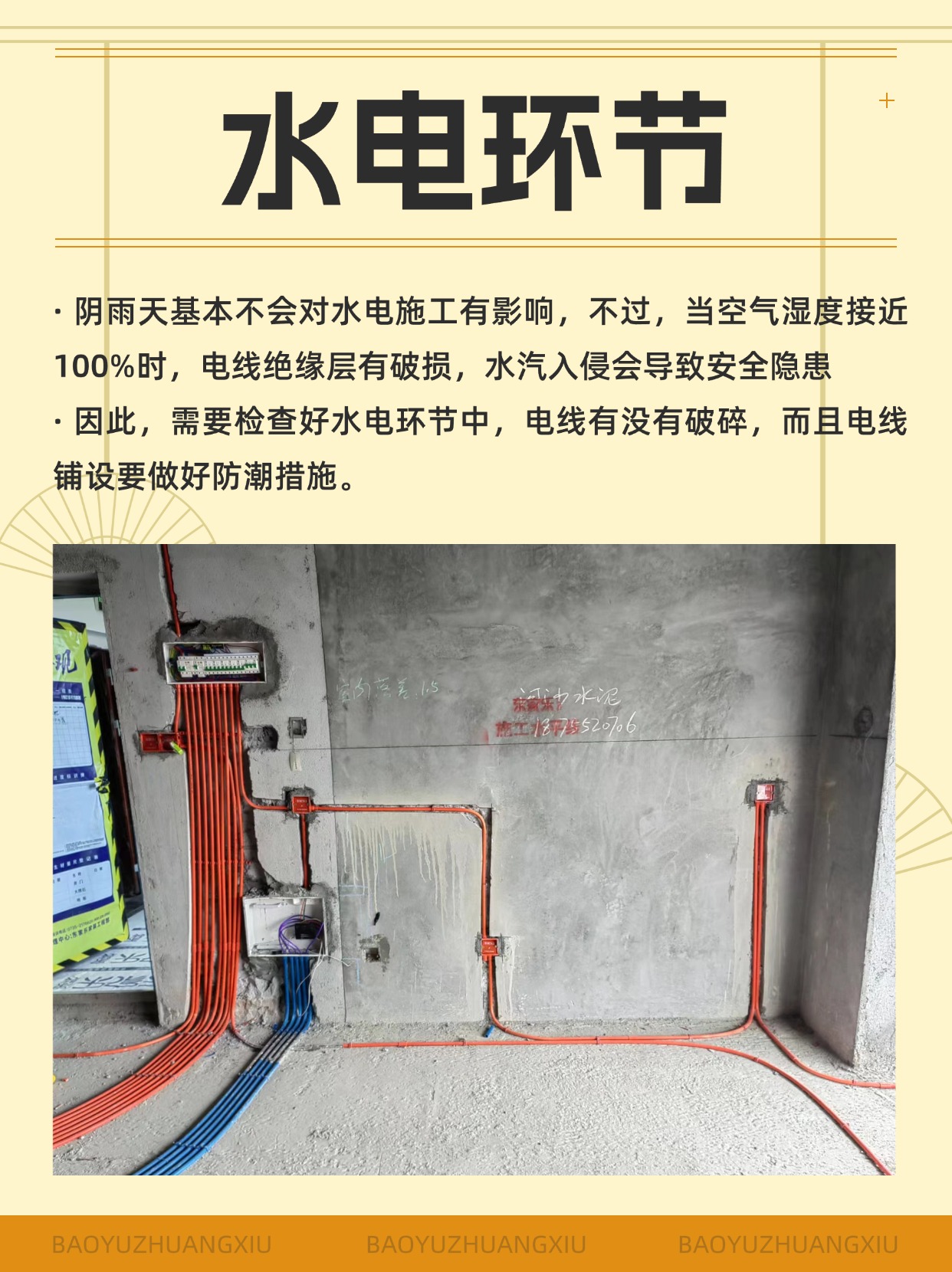 陰雨天基本不會對水電施工有影響,不過,當空氣濕度接近100%時,電線絕緣層有破損,水汽入侵會導致安全隱患