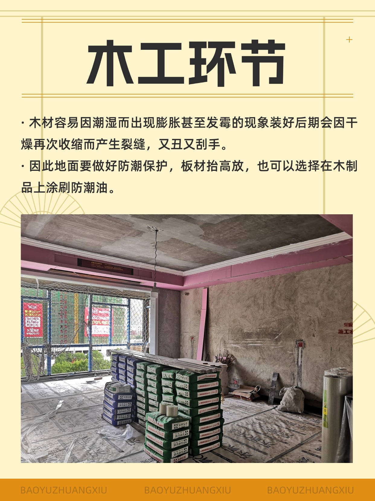 因此地面要做好防潮保護,板材抬高放,也可以選擇在木制品上涂刷防潮油。