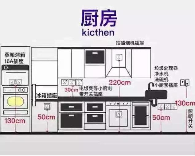 冰箱插座高度30-50厘米,煙機(jī)插座2-2.2米,櫥柜臺(tái)面上方插座,1.1-1.3米。水槽下方凈水器電源高度35-45厘米。嵌入式洗碗機(jī)消毒柜,烤箱,微波爐,冰箱等根據(jù)電器的擺放位置,確定插座的高度。